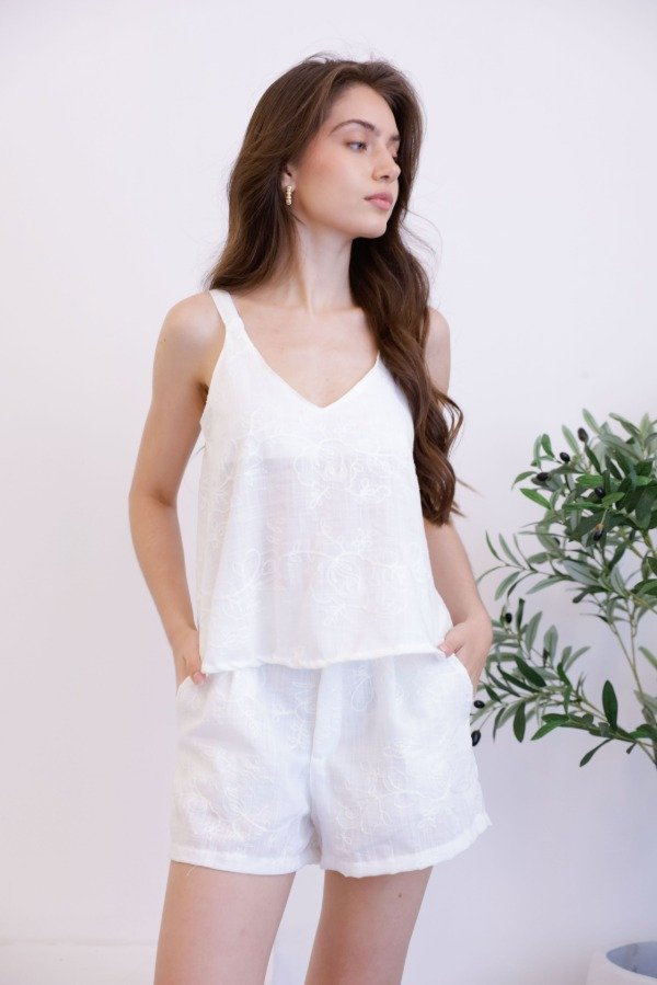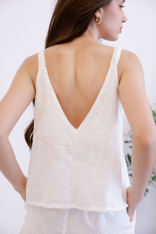 Musculosa escote V y espalda en V, breteles anchos y corte evasé en tela bordada. En tela símil lino bordada a tono. Hace conjunto con el short Fressia