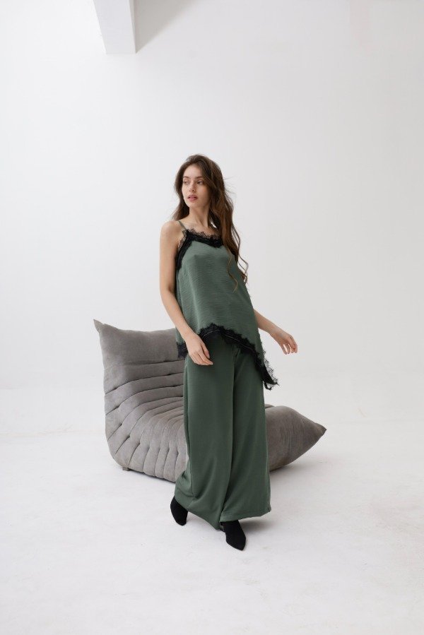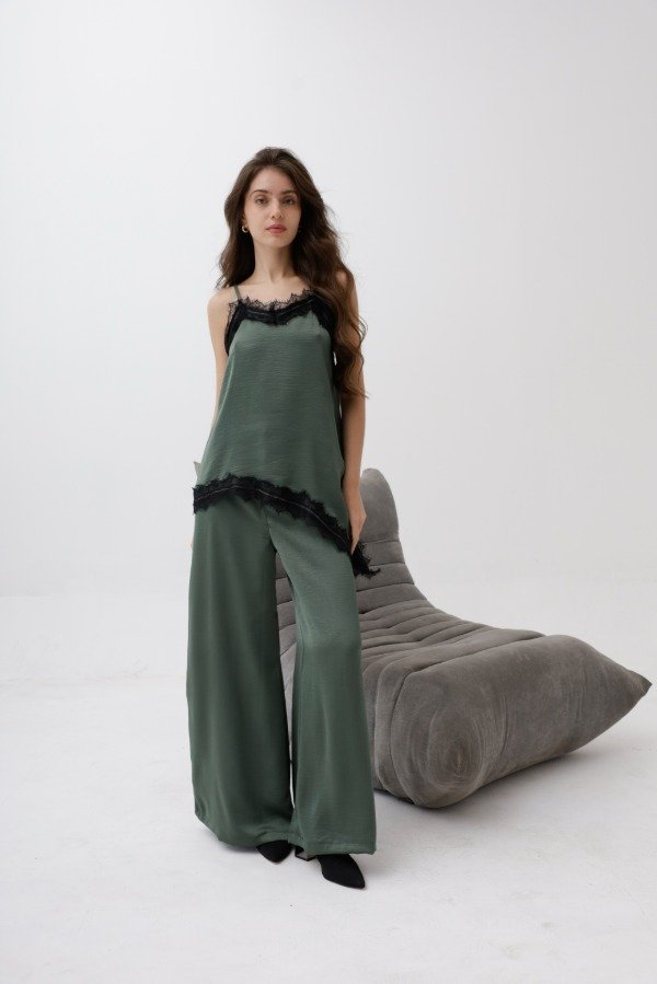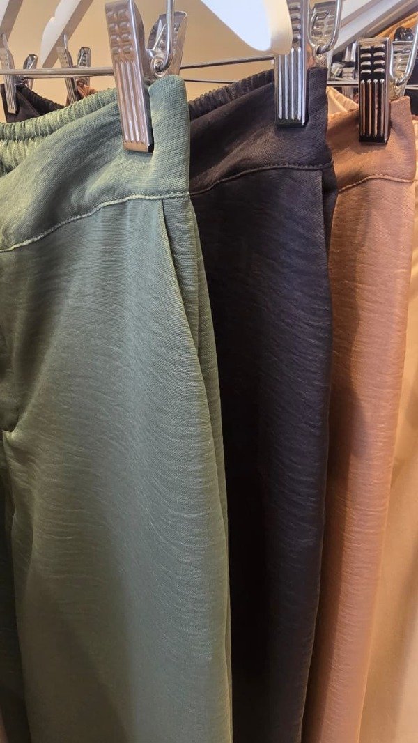 Pantalón corte palazzo en satin arrugado. Colores Negro, Blanco,Chocolate y verde.