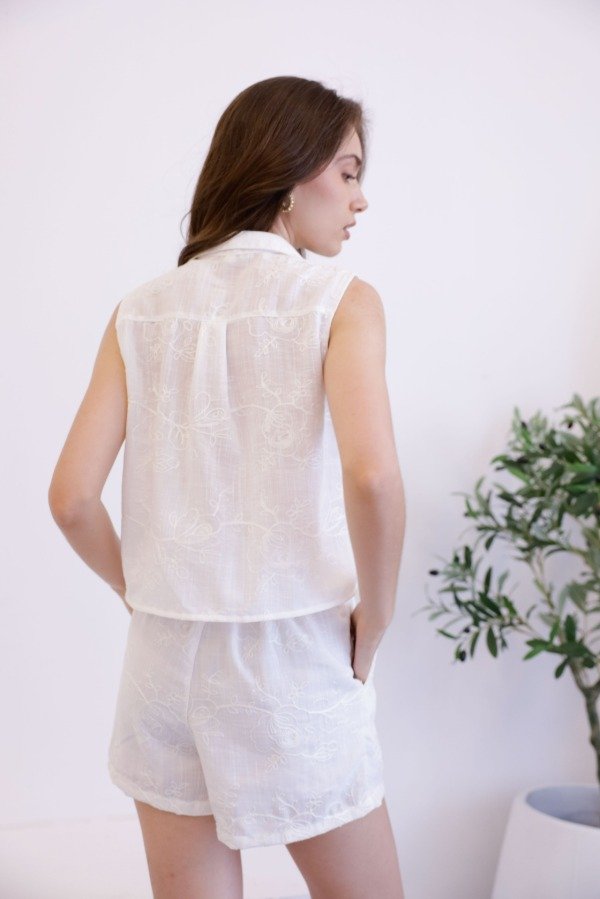 Short sastrero en simil lino bordado a tono, con elástico en espalda, pinzas y bolsillos. Hace conjunto con la camisa Fressia y con el top Mielcita fresia