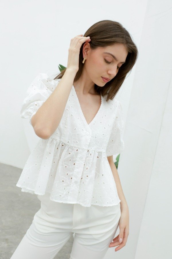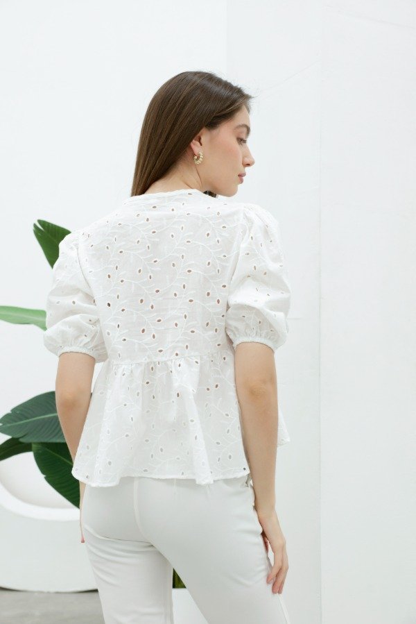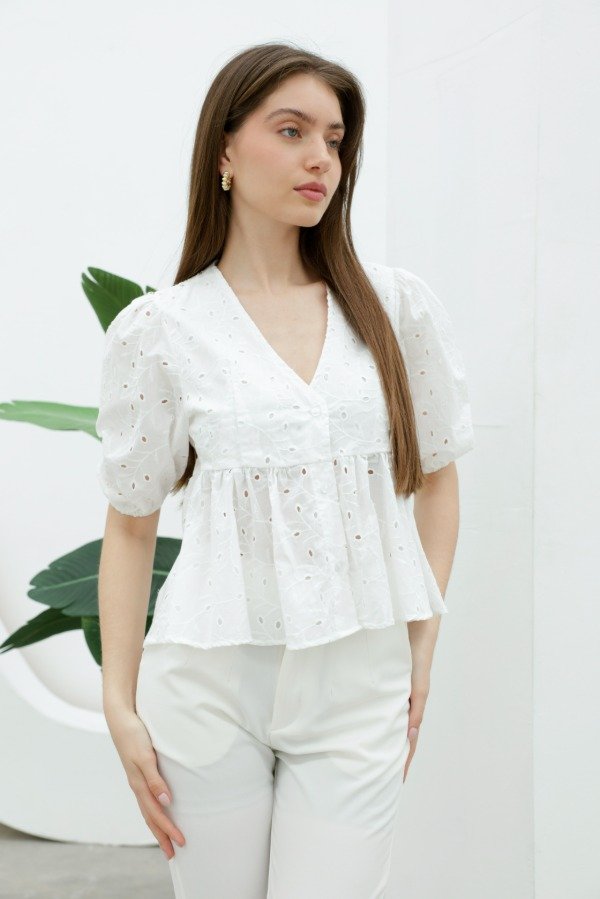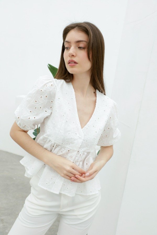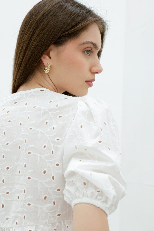 Camisa manga globo ¾ con elástico, escote V y corte princesa en broderie de algodón