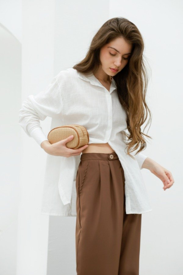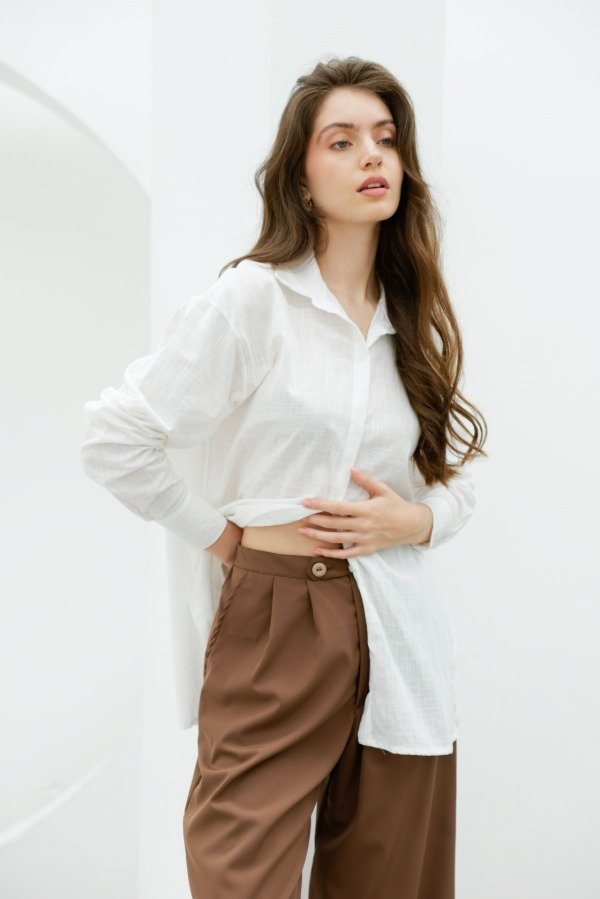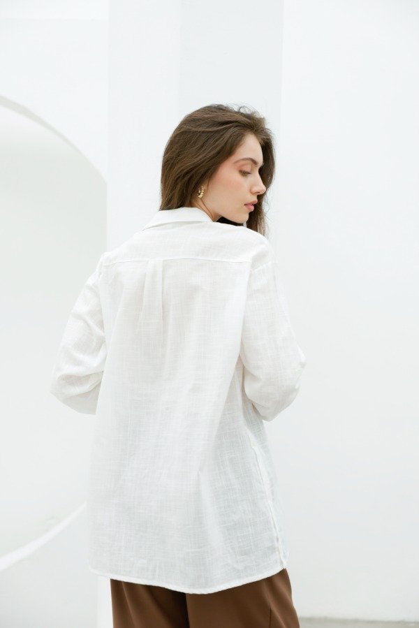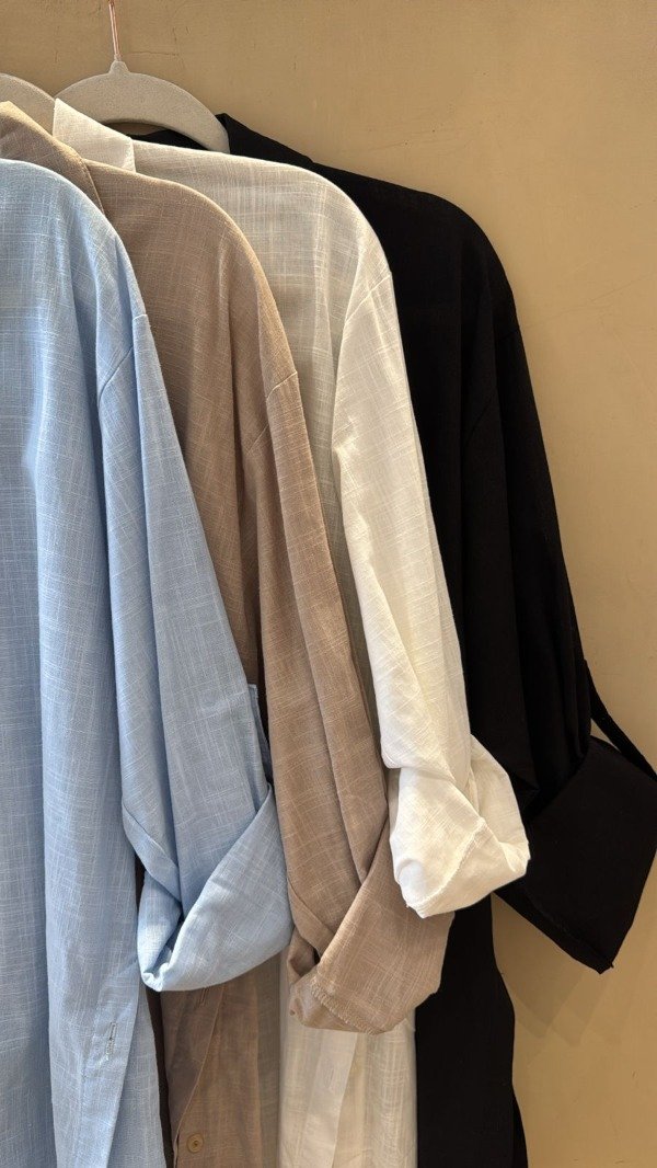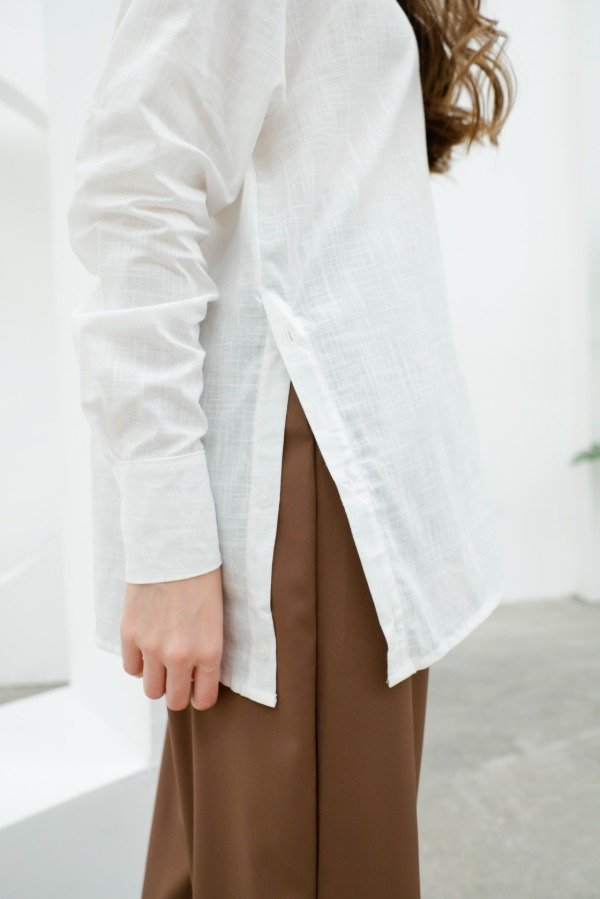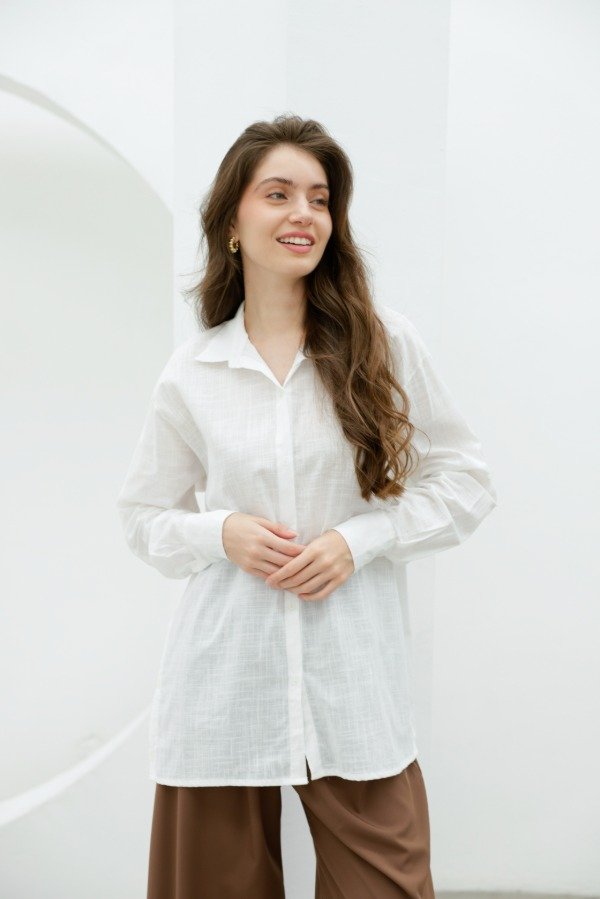 Camisa manga larga de algodón 100% con tramado de lino, lo que lo hace súper respirable y fresco. Corte oversize, larga, con tajos abotonados laterales y presilla en mangas para arremangar.