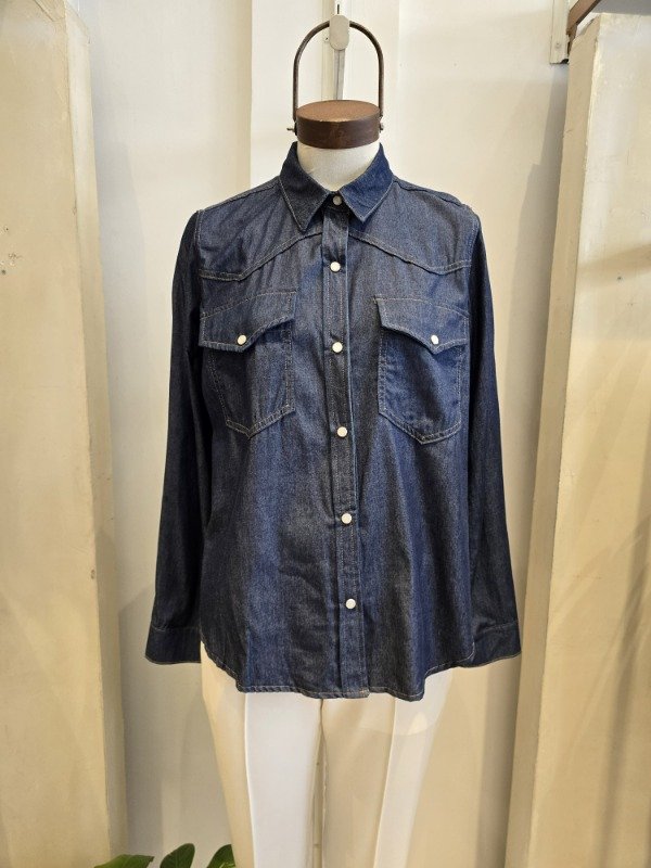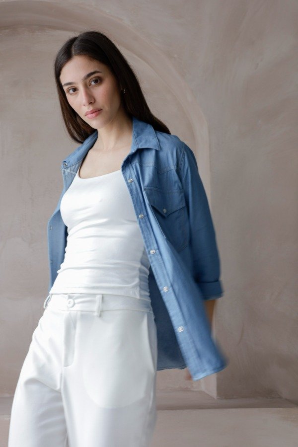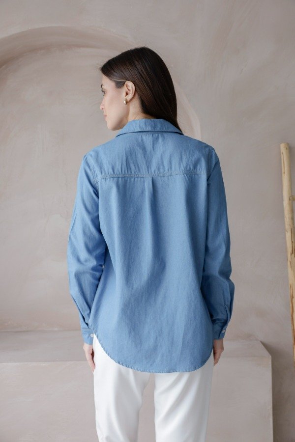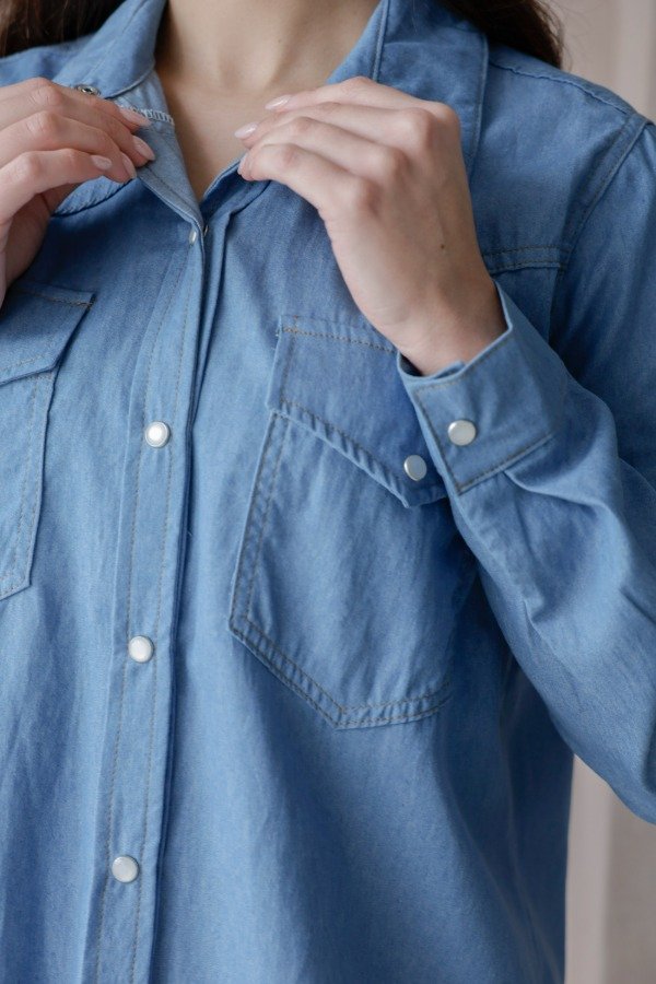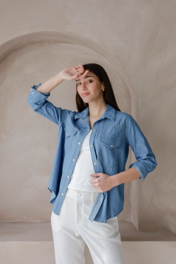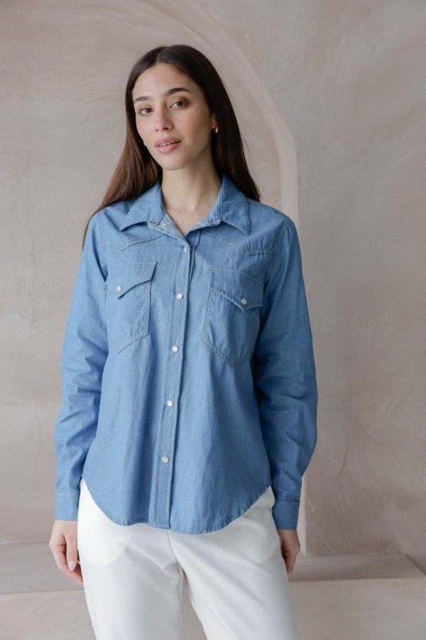Camisa manga larga en denim camisero prelavado (100% algodón). Broches snaps en perlado contratono, 2 bolsillos y detalle de pespuntes dobles en contratono camel.