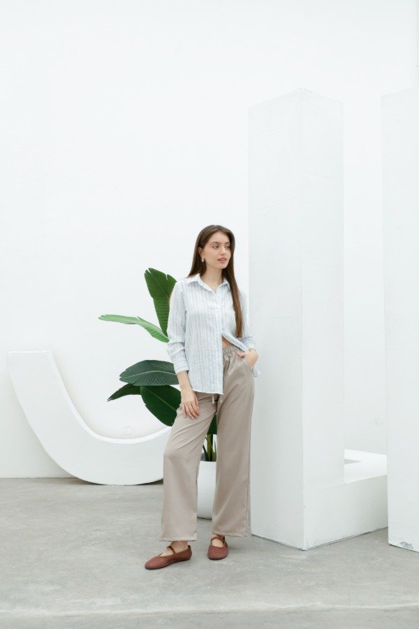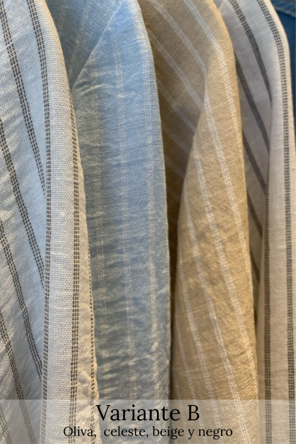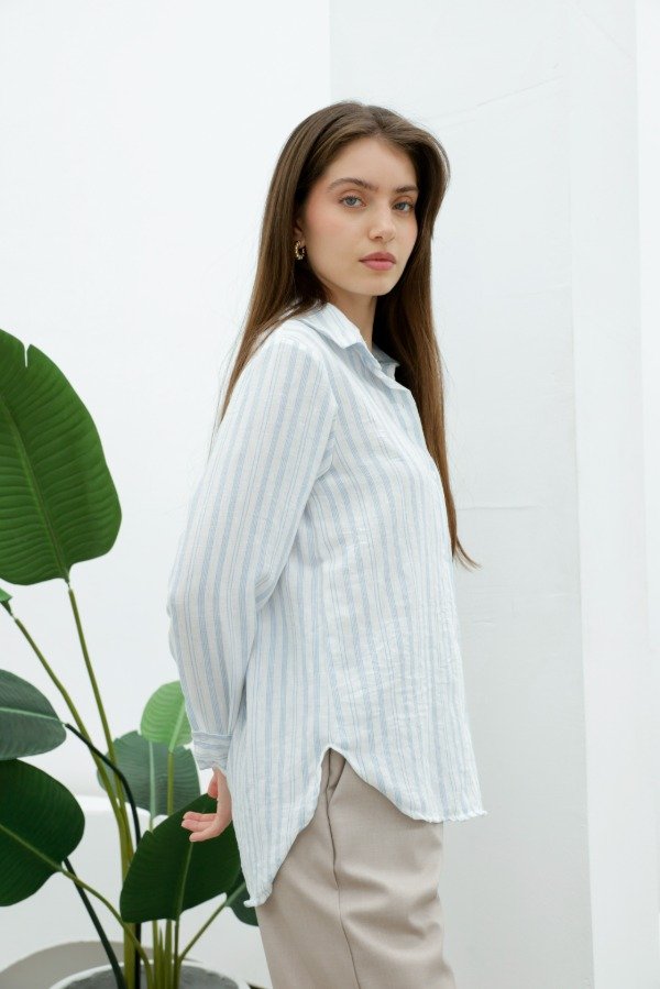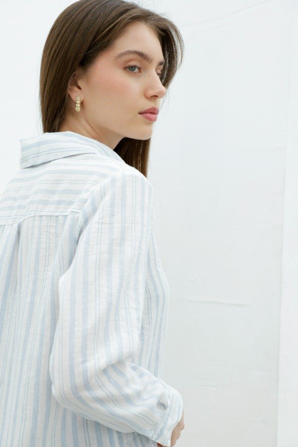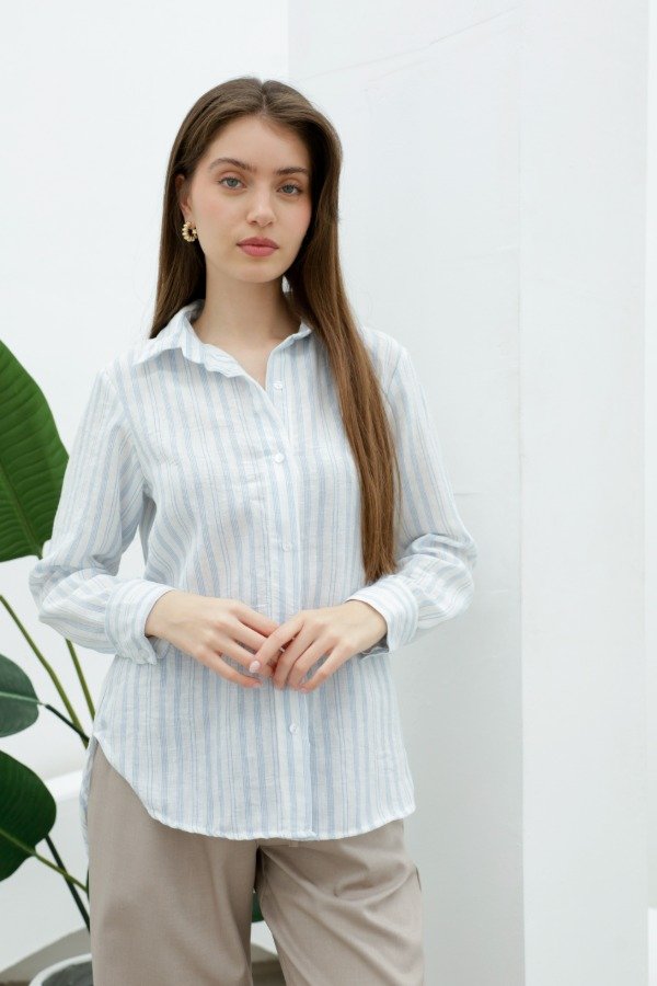 Camisa manga larga en símil lino rayado de corte recto irregular (más largo en la espalda)