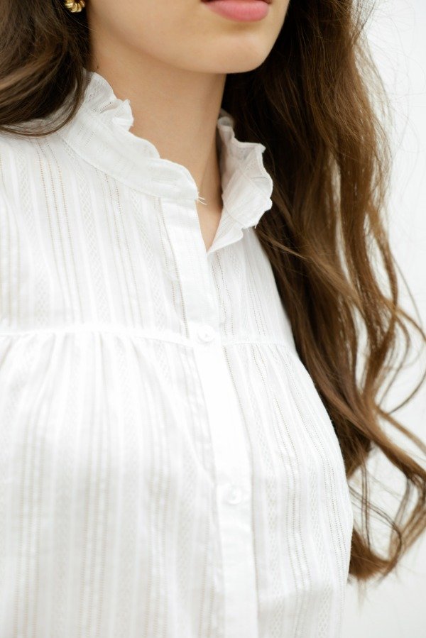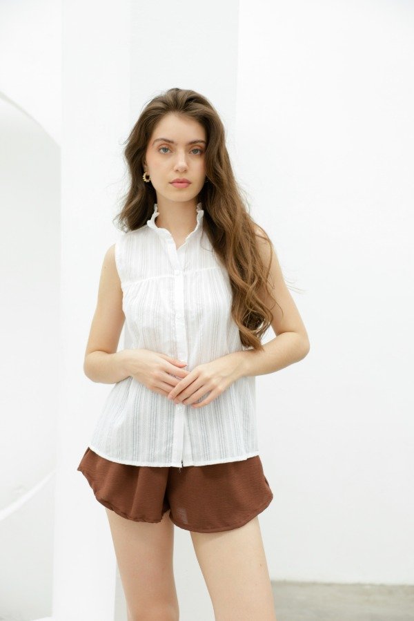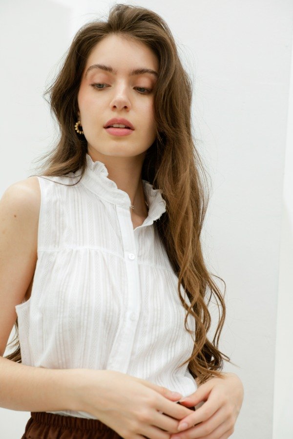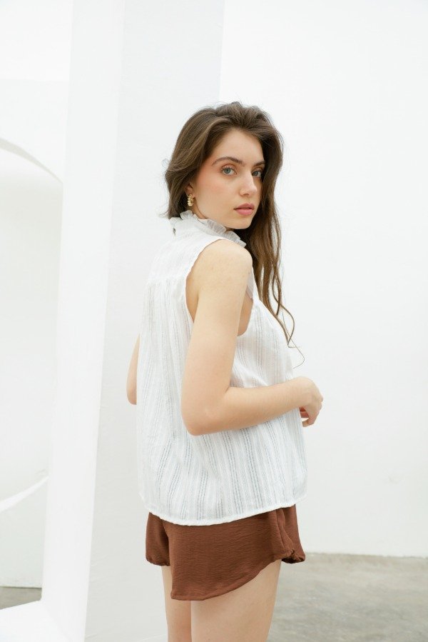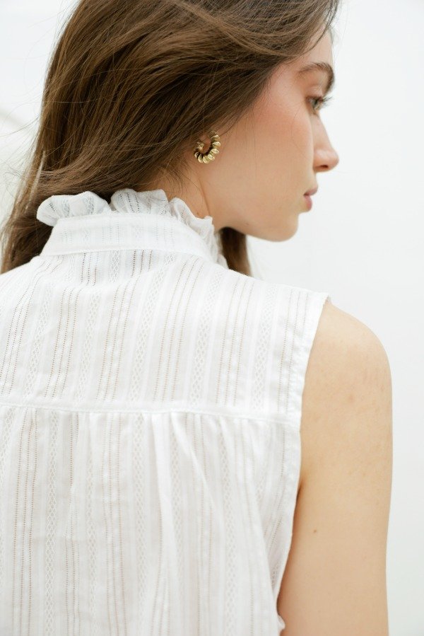 Camisa sin mangas de algodón 100% texturado con cuello con volado, canesú en delantero y espalda, con frunces para un toque más femenino.