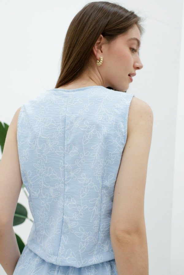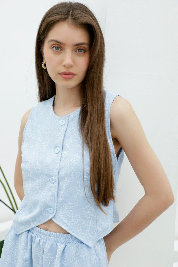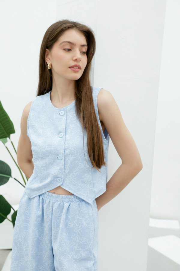 Camisa corta manga corta en cey puffing (estampa símil bordado), con cordón para ajustar en la cintura. Combinable con el palazzo Nardo.