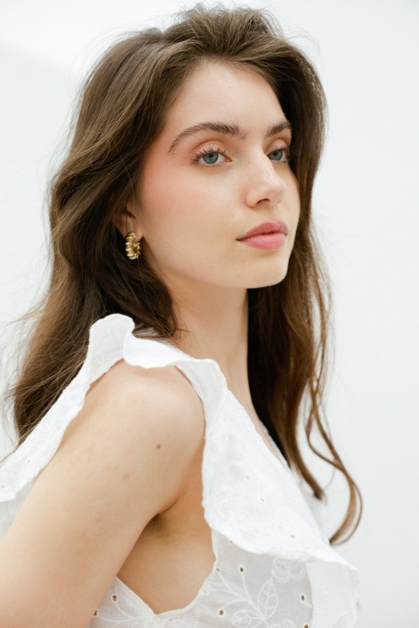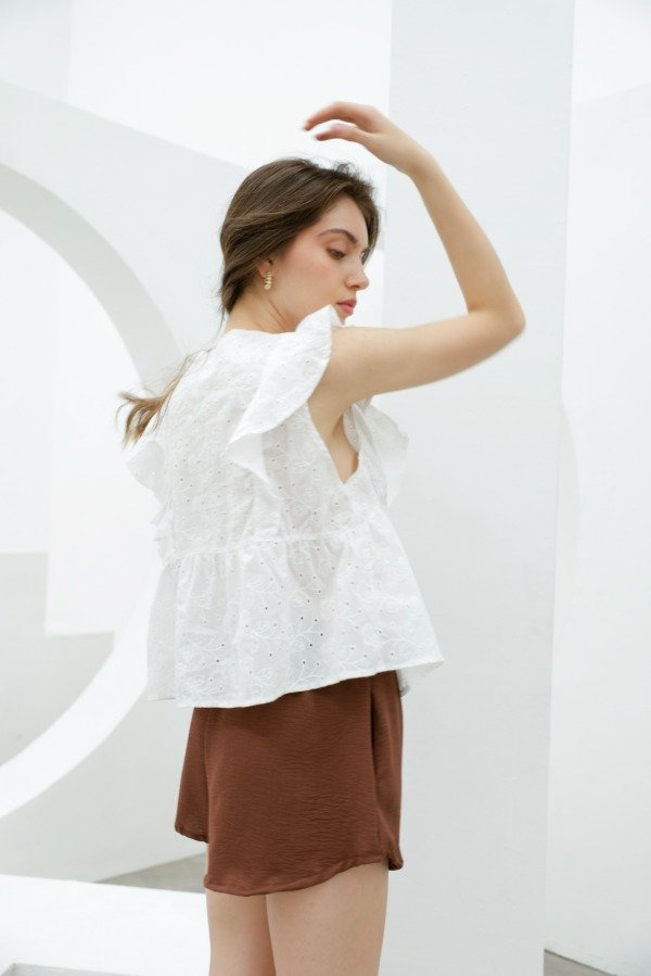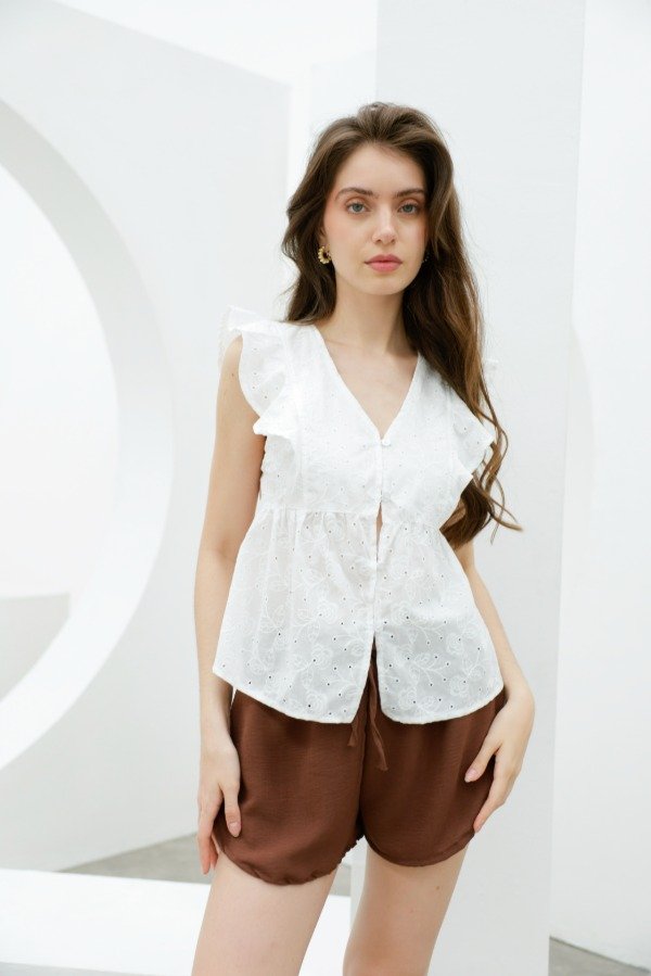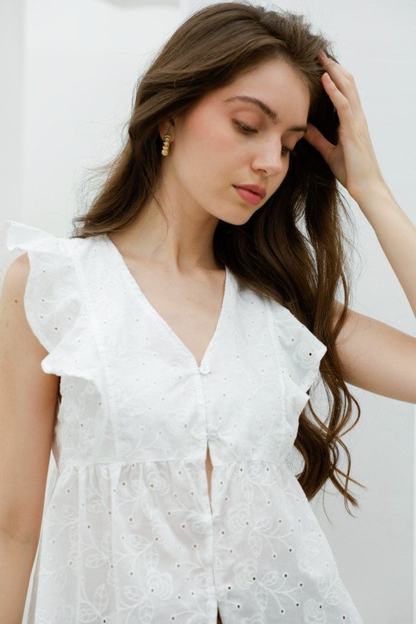 Camisa sin mangas en broderie con recorte imperio y volados a lo largo de en espalda, hombro y pecho.