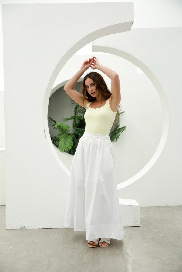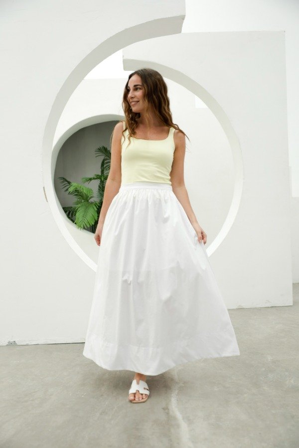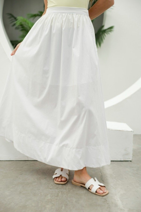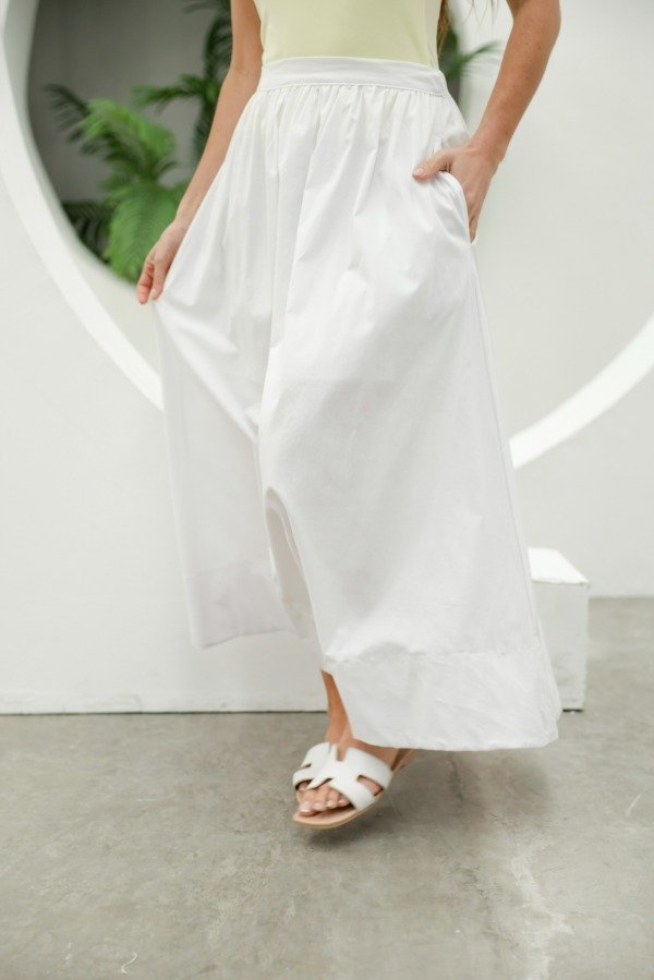 Maxifalda en corte A, en tela de algodón poplín con vista inferior, bolsillos y elástico en la espalda.