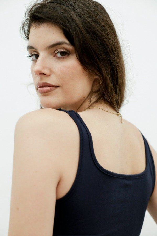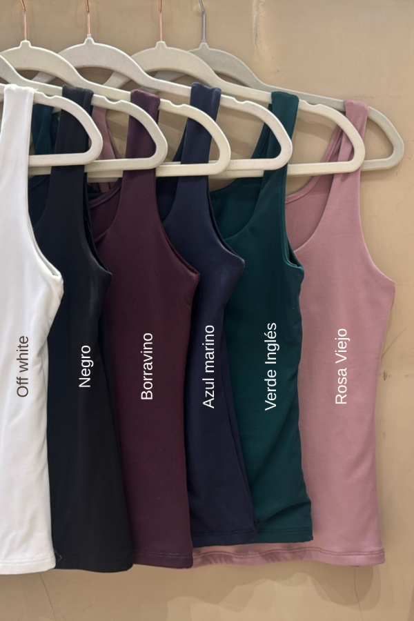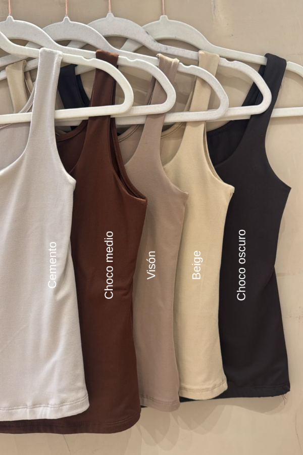 Musculosa básica de MODAL SOFT doble capa en delantero (Vista entera). Breteles anchos y escote cuadrado. Sin costuras frontales salvo terminación de cintura. Terminaciones de collareta en la espalda.