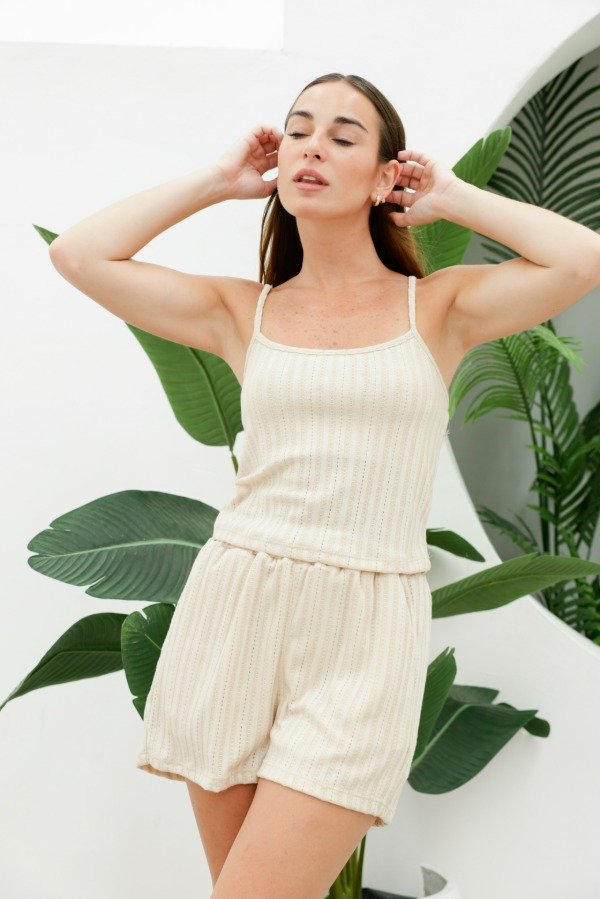 Musculosa de tela tejida con breteles finos y elástico en espalda. Hace conjunto con el short Geranio y el palazzo Geranio
