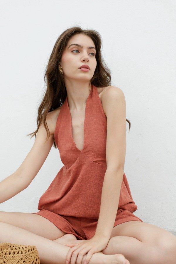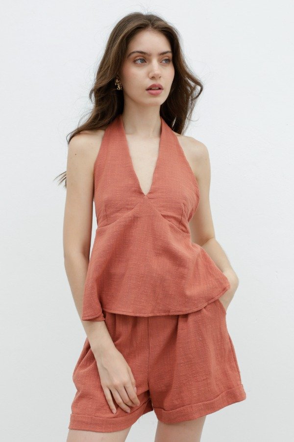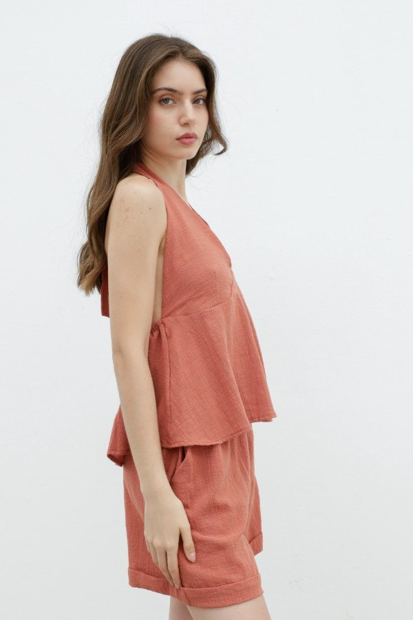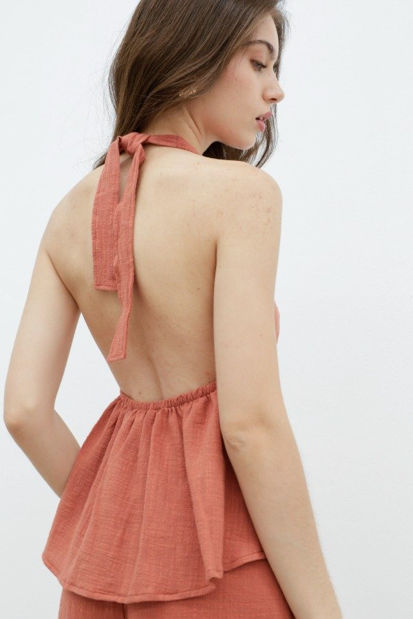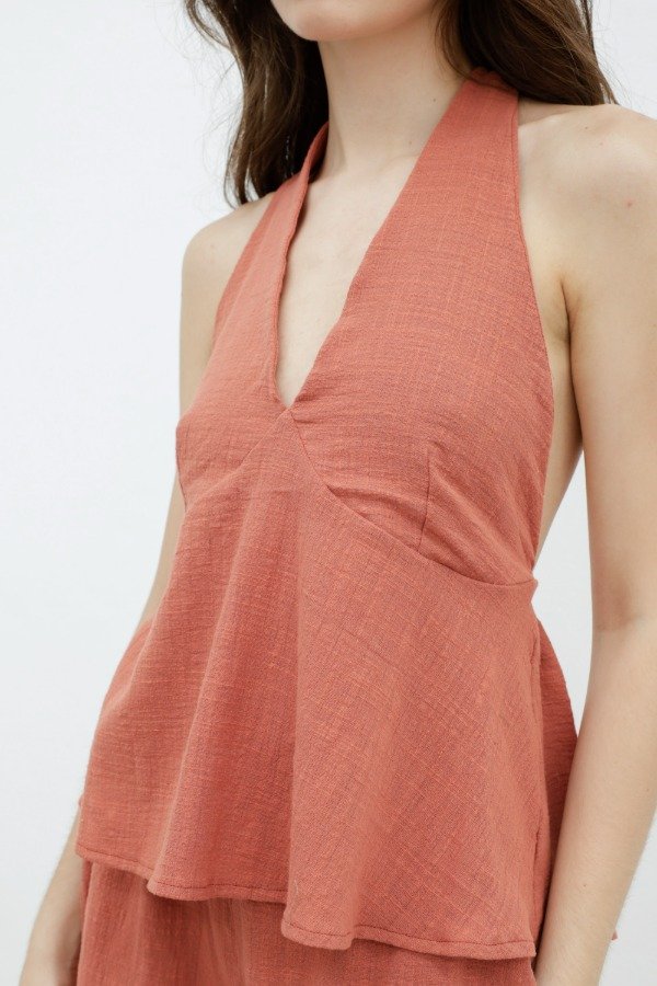 Musculosa escote marilyn con tiras para atar en el cuello, elástico en la espalda.