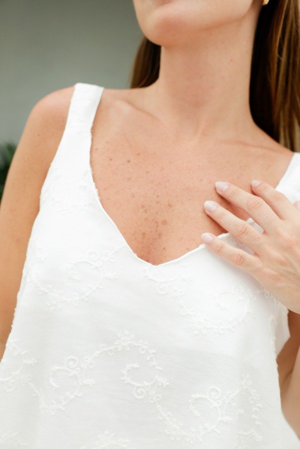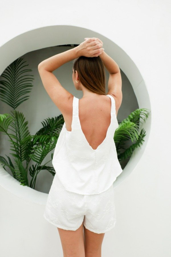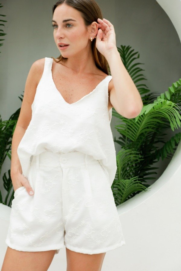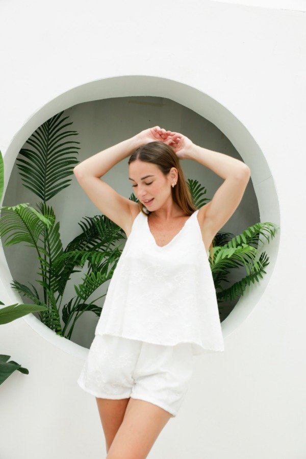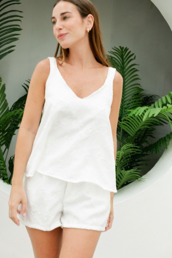 Musculosa escote V y espalda en V, breteles anchos y corte evasé en tela bordada. Hace conjunto con el short Magnolia