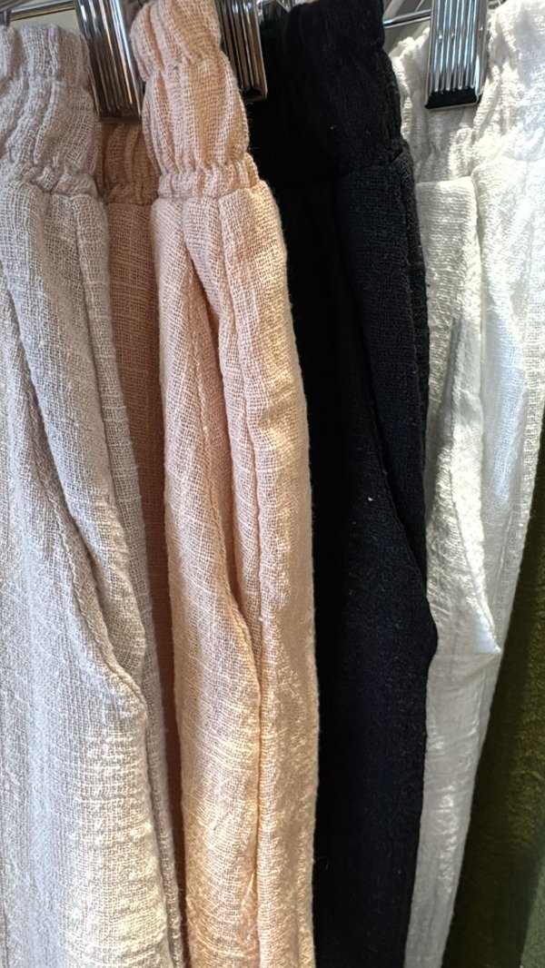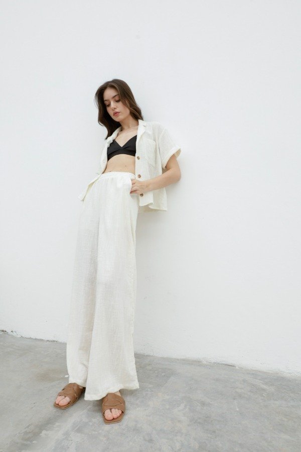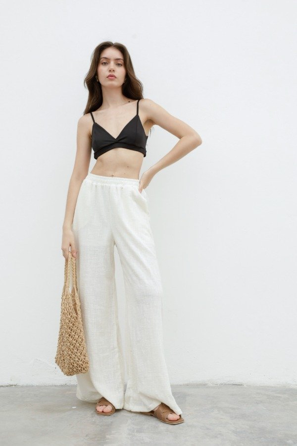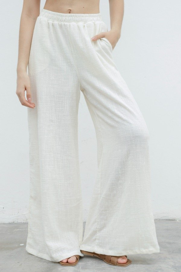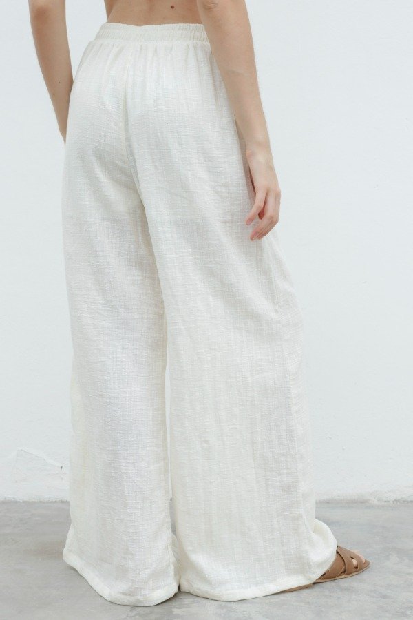 Palazzo de lino de algodón con elástico en cintura y bolsillos. El blanco tiene forrería.