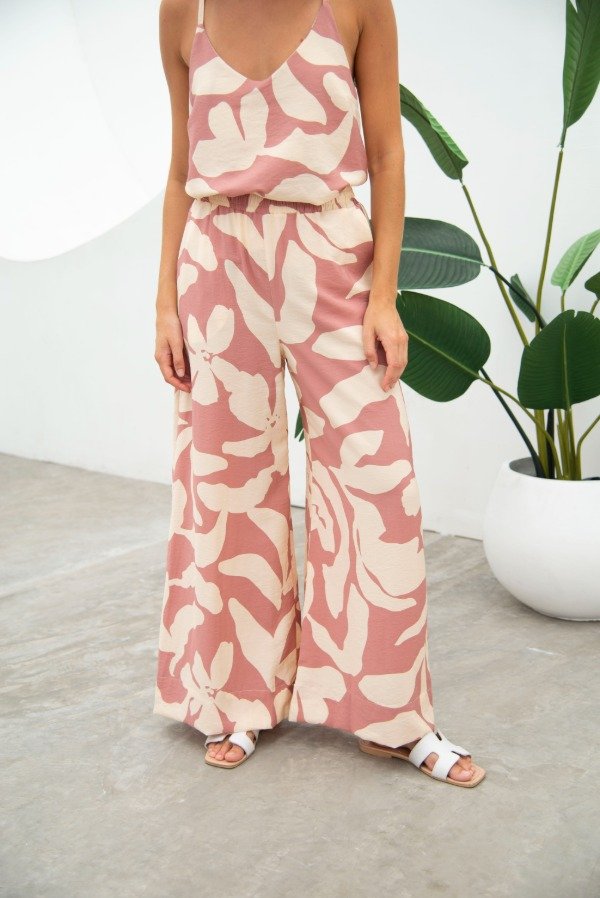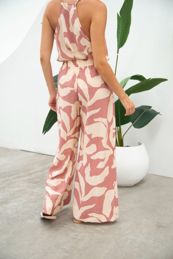 Palazzo amplio en sedita de poliéster estampada con bolsillos y elástico en toda la cintura. Hace conjunto con la musculosa Adri estampada, con el Pañuelo y el Kaftan.