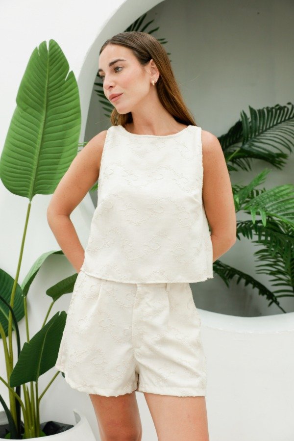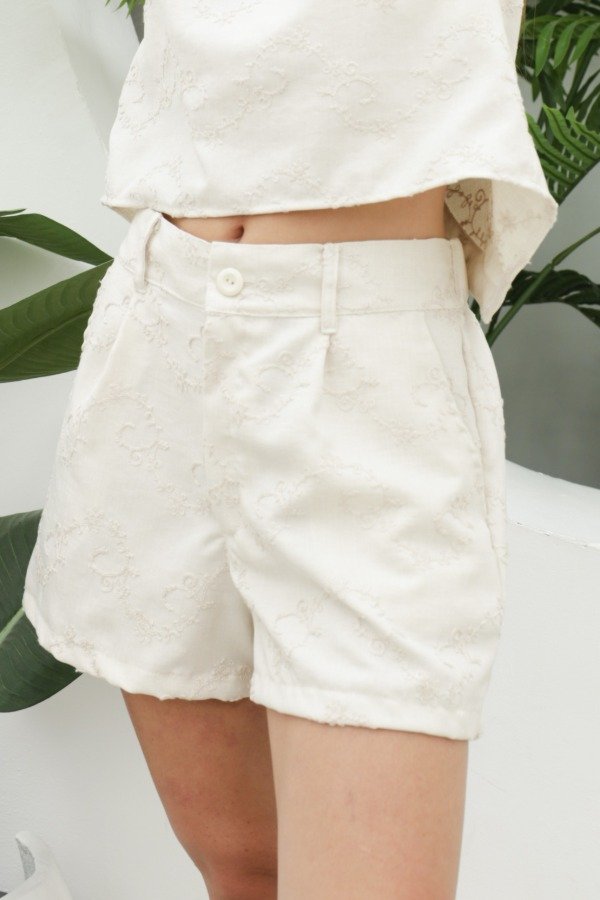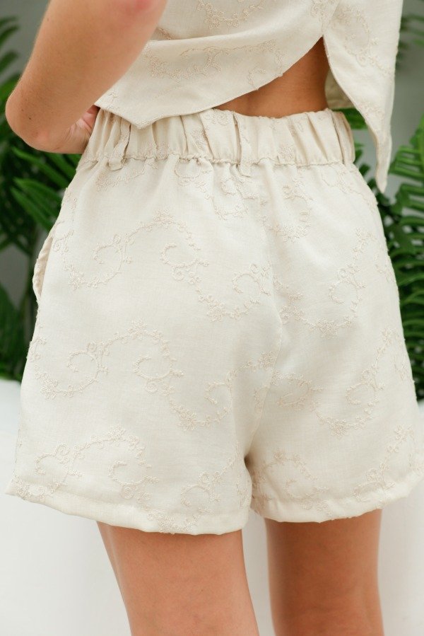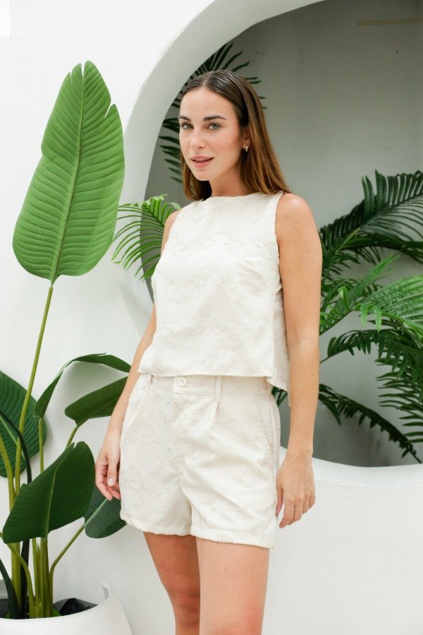 Short sastrero en tela bordada, con elástico sólo en espalda, pinzas frontales y bolsillos. Se pueden hacer conjunto con el top Magnolia y el top Mielcita