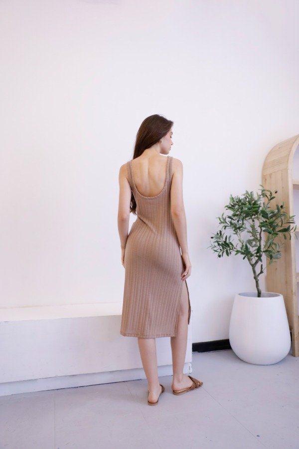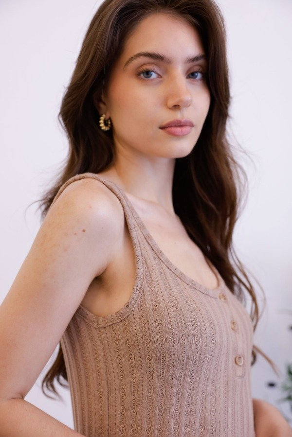 Vestido midi al cuerpo en tela tejida, con breteles anchos y carterita en el escote.